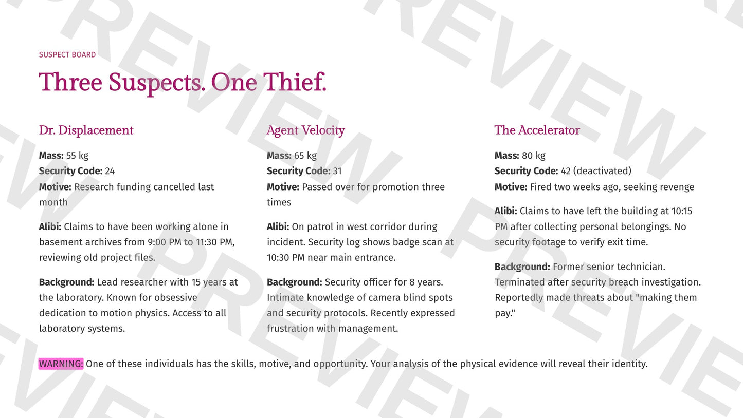 Someone broke into the Advanced Propulsion Lab and stole the experimental Hyper-Drive prototype. Students must analyze evidence at 5 stations, solve 1D motion problems, and identify which suspect committed the crime.
