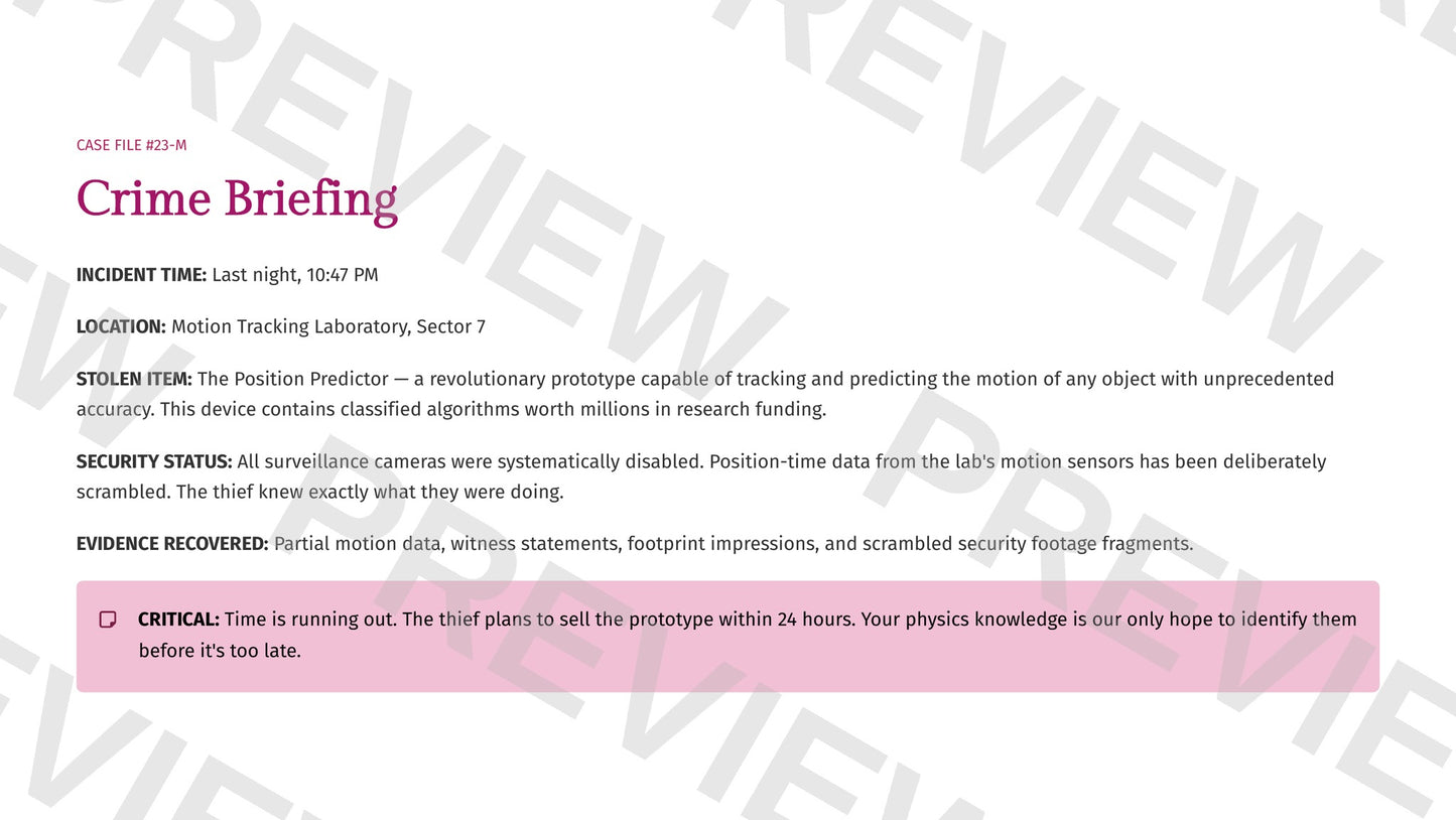 CSI meets physics class. Your students are investigators — and they need kinematics to crack the case.